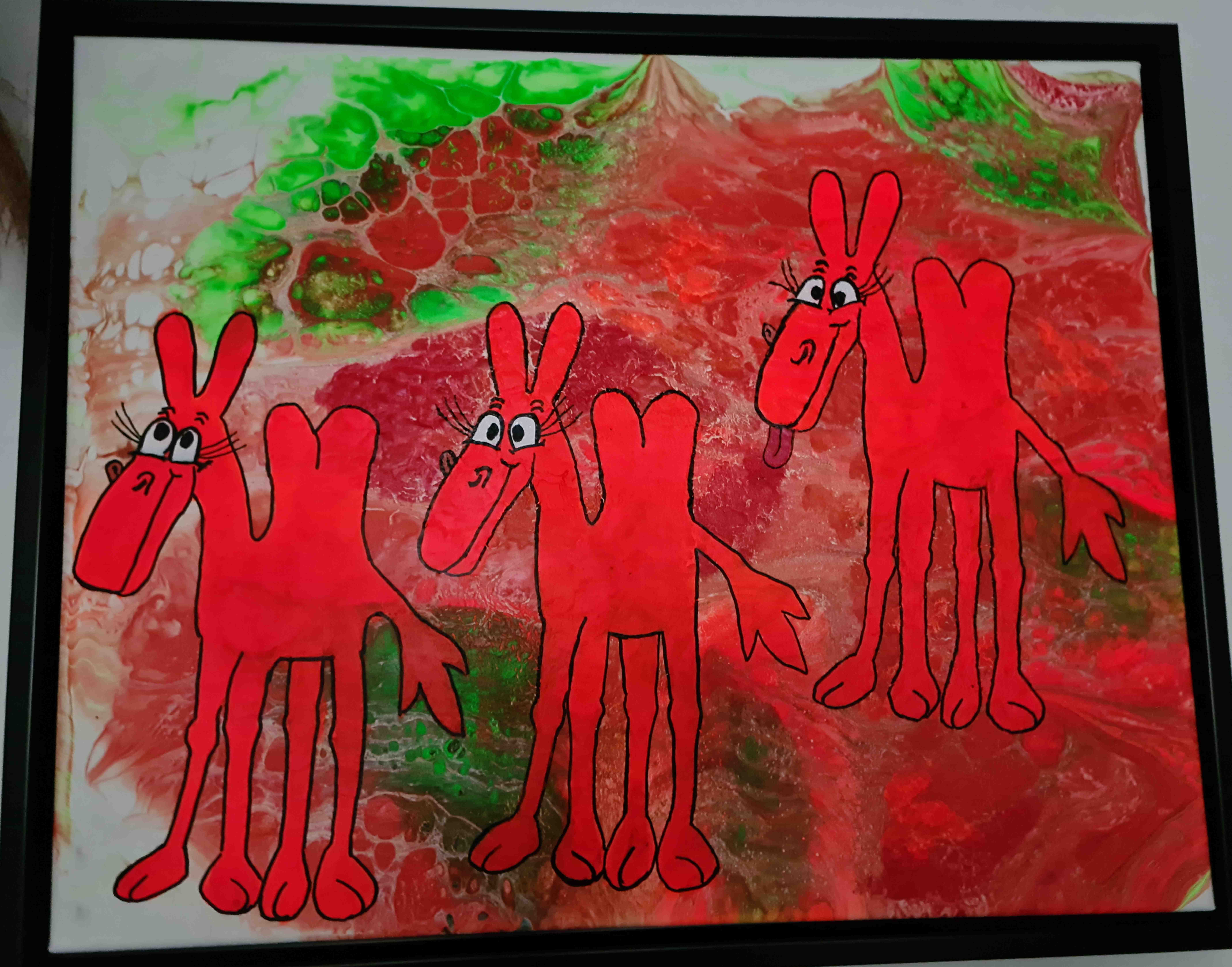 Da jeg havde malet denne flotte baggrund, fik jeg inspirationen til disse sjove kameler på tur i ørkenen.