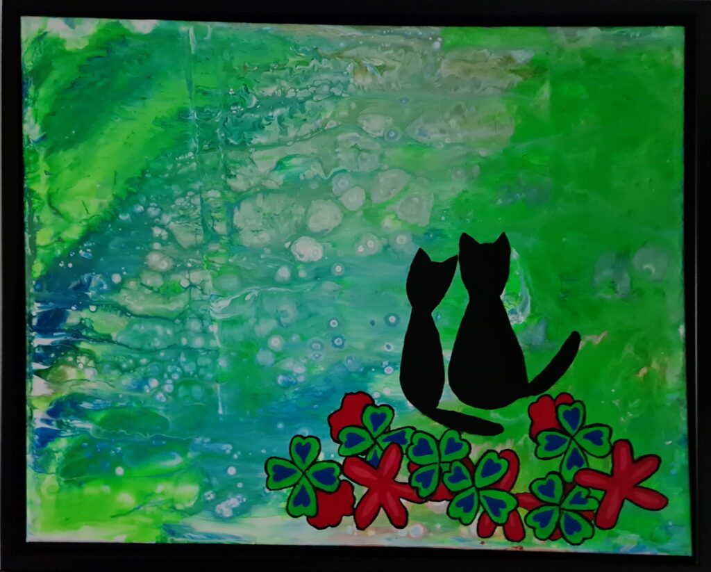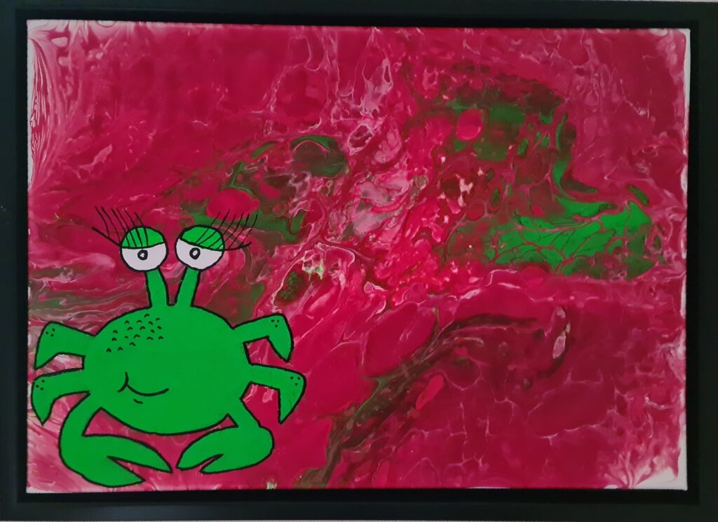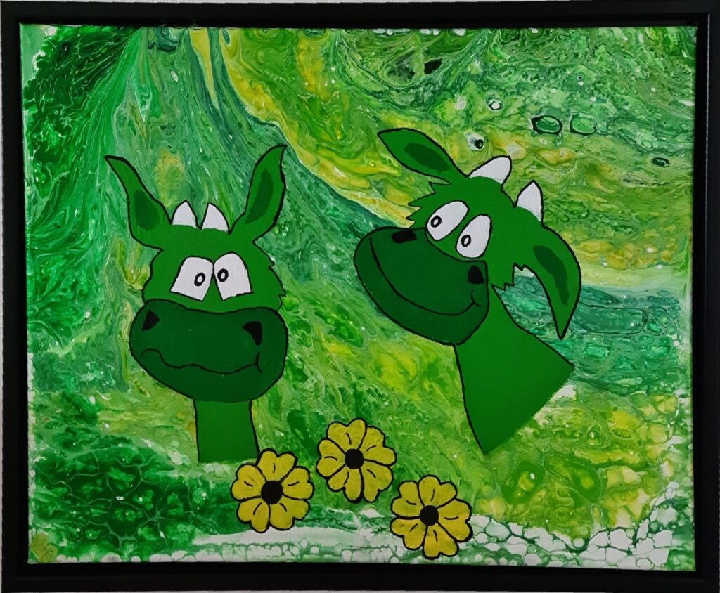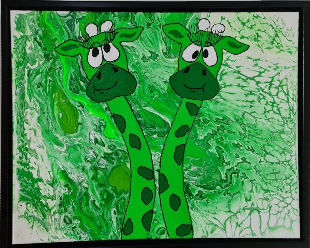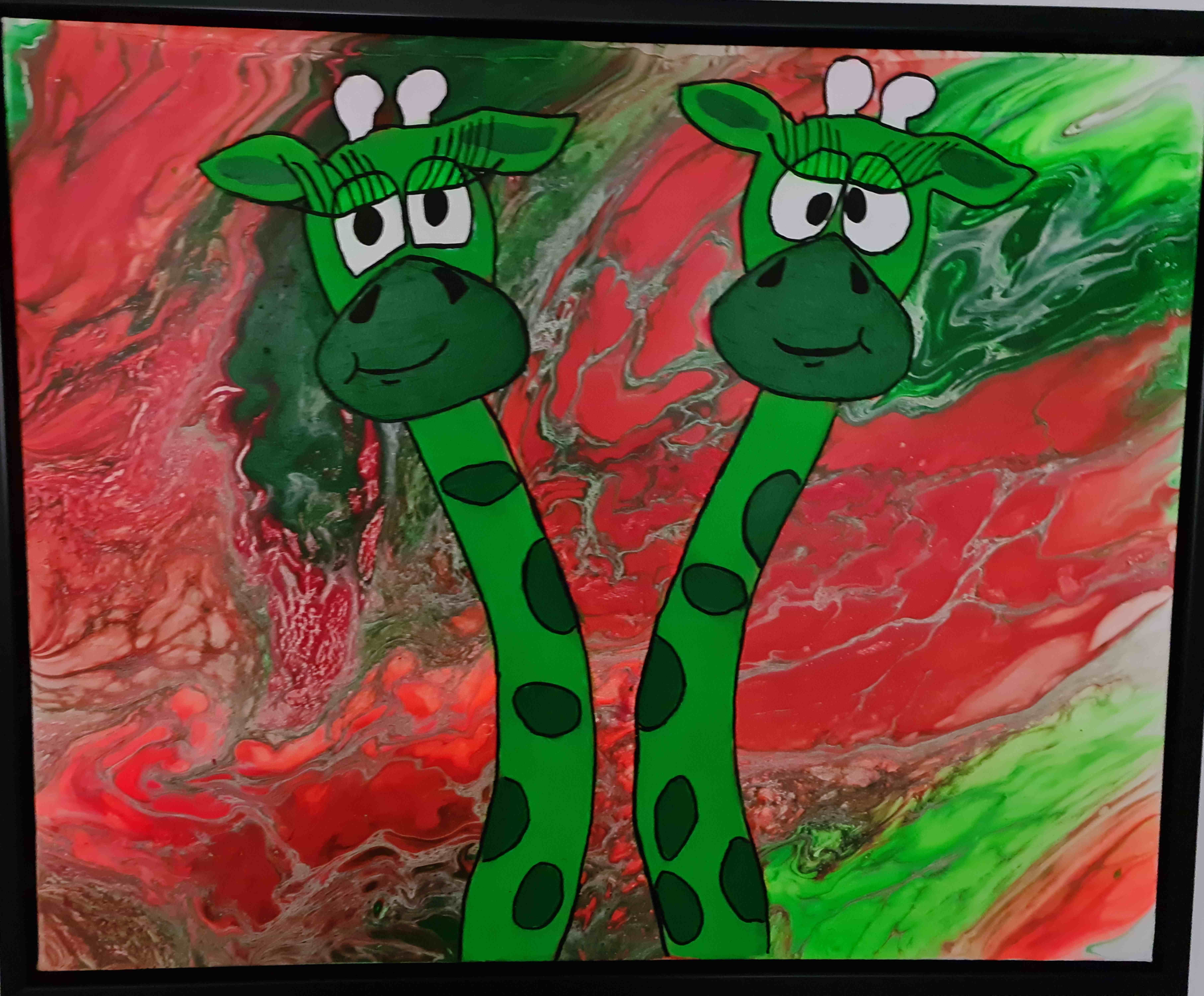 Da jeg havde malet baggrunden, blev jeg inspireret til disse glade grønne giraffer.